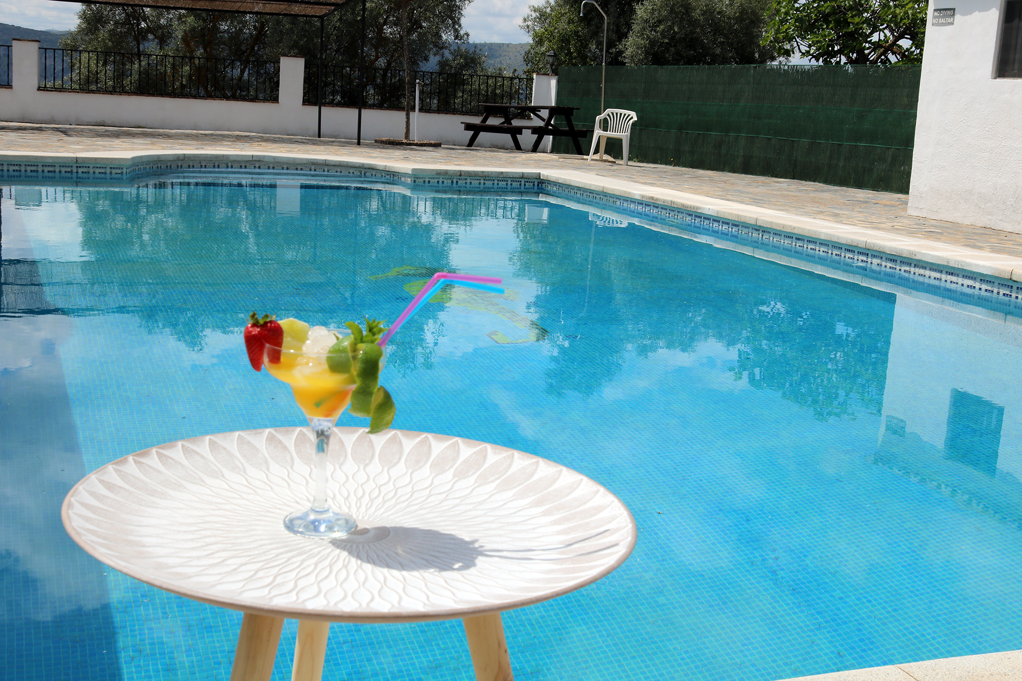 La zona exterior cuenta con un comedor cubierto y una zona de barbacoa, además de una piscina de 12 x 6 metros (de uso compartido). Las tumbonas y sombrillas le invitan a descansar o disfrutar de las impresionantes vistas.